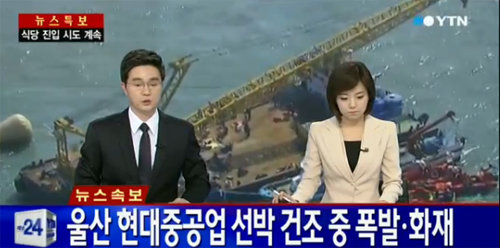21일 오후 4시 5분께 울산광역시 동구 전화동에 있는 현대중공업에서 선박 건조중 폭발로 인한 화재가 발생했다.