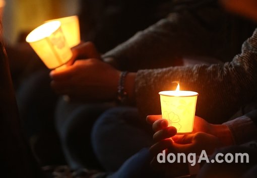 전남 진도 여객선 ‘세월호’ 침몰 엿새째인 21일 오후 서울 종로구 동화면세점 앞에서 열린 ‘세월호 실종자 무사생환 기원’ 촛불행사에서 참가자들이 세월호 사망자들의 명복을 빌고 무사생환을 기원하는 촛불을 밝히고 있다.