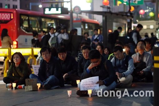전남 진도 여객선 ‘세월호’ 침몰 엿새째인 21일 오후 서울 종로구 동화면세점 앞에서 열린 ‘세월호 실종자 무사생환 기원’ 촛불행사에서 참가자들이 세월호 사망자들의 명복을 빌고 무사생환을 기원하는 촛불을 밝히고 있다.