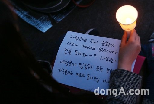 전남 진도 여객선 ‘세월호’ 침몰 엿새째인 21일 오후 서울 종로구 동화면세점 앞에서 열린 ‘세월호 실종자 무사생환 기원’ 촛불행사에서 참가자들이 세월호 사망자들의 명복을 빌고 무사생환을 기원하는 촛불을 밝히고 있다.