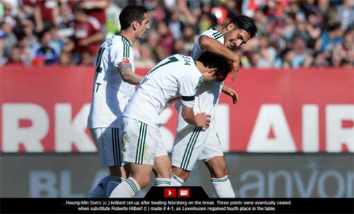 손흥민(22·레버쿠젠)의 활약이 눈부시다. 손흥민은 21일(한국시간) 그룬디히 슈타디온에서 끝난 뉘른베르크와의 2013∼2014시즌 독일 분데스리가 31라운드 원정경기에 출전해 1도움을 올리며 팀의 4-1 대승을 이끌었다. 세월호 침몰 희생자들을 애도하기 위해 오른팔에 검은 띠를 두른 손흥민은 2-1로 앞선 후반 35분 60여m에 이르는 폭발적인 드리블 돌파에 이은 왼발 땅볼 패스로 팀 동료 에미르 스파히치의 쐐기골을 도왔다. 뉘른베르크 수비수가 끝까지 따라붙었지만 손흥민의 스피드를 감당하지 못했다.