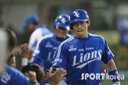 25일 오후 서울 목동야구장에서 열린 ‘2014 프로야구’ 넥센 히어로즈 대 삼성 라이온즈 경기 2회초 1사 1, 3루에서 삼성 이흥련의 2타점 적시타로 홈을 밟은 1루주자 이영욱과 3루주자 이승엽이 덕아웃 동료선수들의 환영을 받고 있다.