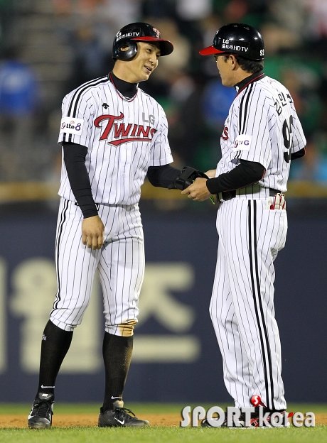 25일 오후 서울 잠실구장에서 열린 ‘2014프로야구’ KIA 타이거즈와 LG 트윈스의 경기에서 LG 오지환이 7회말 2사 1,2루 때 1타점 2루타를 치고 김민호 코치의 격려를 받고 있다.