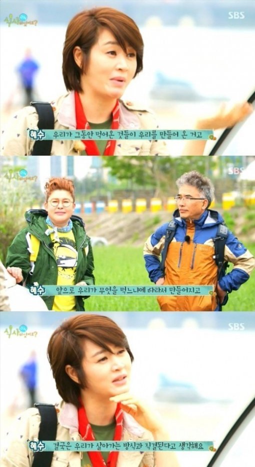 이날 세 명의 진행자들은 여행 전에 한강 둔치에서 만났다. 김혜수는 따스한 포옹으로 임지호, 이영자와 인사를 나눴다.