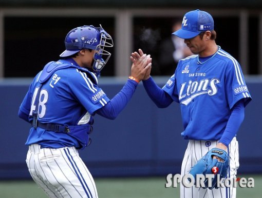 삼성이 여전히 마운드의 건재함을 과시하며 위닝시리즈를 거둬냈다. 27일 오후 서울 목동야구장에서 열린 ‘2014 한국 야쿠르트 세븐 프로야구’넥센 히어로즈와 삼성 라이온즈의 경기에서 삼성이 선발 장원삼의 6이닝 무실점 호투, 안지만과 임창용의 철벽 뒷문에 힘입어 넥센을 2-1로 꺾고 위닝시리즈를 거둬냈다. 경기 종료 후 삼성 마무리 임창용, 포수 이흥련이 그라운드에서 기쁨을 나누고 있다.