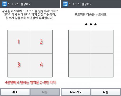 그러면 노크 코드 설정 화면이 나타날 것이다. 노크 코드는 4분면에서 원하는 영역을 2~8번 터치해서 설정할 수 있다. 예를 들면 3분면 2번 터치 + 1분면 1번 터치 등의 방식으로 패턴을 정하면 된다. 노크 패턴은 최대 8자리까지 설정할 수 있는데, 횟수가 적으면 간편하고 많으면 보안성이 높아진다. 노크 패턴을 입력했다면 ‘다음’ 버튼을 누르자.
