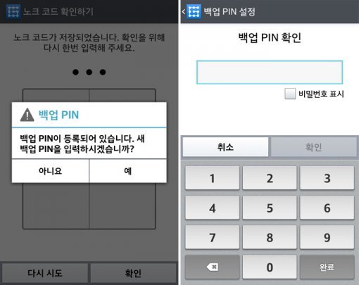 마지막으로 백업 PIN을 등록한다. 백업 PIN은 노크 코드 패턴을 잊어버렸을 때를 대비해 설정해 두는 비밀번호로, 4자리 이상의 숫자여야 한다. 백업 PIN을 2번 입력하면 노크 코드 설정이 끝난다.