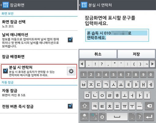 설정 - 화면 - 잠금화면 메뉴를 보면 ‘분실 시 연락처’라는 기능이 있다. 여기에 V표 체크한 뒤 톱니바퀴 모양의 설정 화면으로 들어가면, 스마트폰 잠금화면에 표시할 문구를 입력할 수 있다. ‘폰 습득 시 ~로 연락주세요’ 등의 문구를 적으면 된다. 참고로 자신의 스마트폰을 잃어버렸을 때를 대비한 것이니, 자신의 휴대폰 번호를 적는 것은 소용이 없다. 가족이나 친구 연락처, 회사 전화번호 등을 기입하는 것이 좋겠다. 문구를 입력했다면 ‘저장’ 버튼을 누르자.