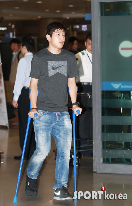 새끼발가락 부위 염증 악화로 수술을 받은 박주호(27.마인츠)가 재활훈련을 위해 28일 오후 인천국제공항을 통해 입국하고 있다.