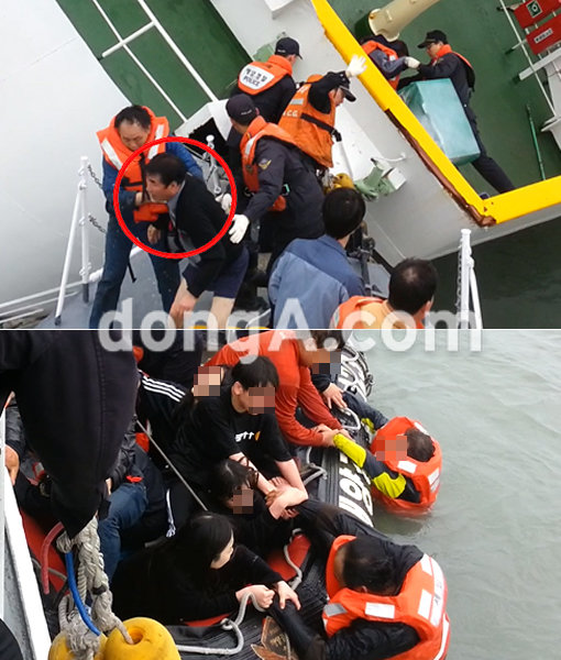 특히 속옷 차림의 이 씨는 배를 버리고 탑승객처럼 구조팀에게 손길을 뻗고 있다. 구조된 승객들이 힘을 합쳐 서로를 돕는 모습과 극명히 대비되는 모습이다.