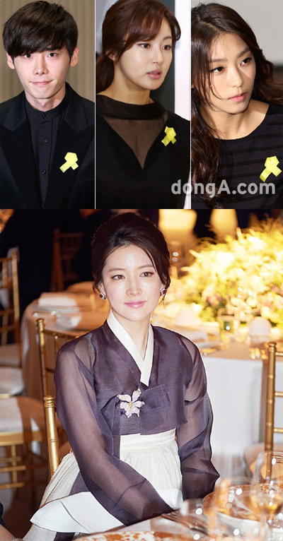 앞서 배우 이영애도 지난 25일 홍콩에서 열린 주얼리 행사에 노란 리본을 착용한 채 등장, 세월호 피해자들에게 조의를 표하며 애도의 뜻을 전했다.