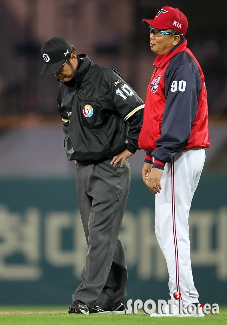 29일 오후 광주-기아챔피언스필드에서 열린 ‘2014프로야구’ KIA 타이거즈와 SK 와이번스의 경기에서 KIA 선동열 감독이 2회초 무사 1,3루 때 1루주자 조동화의 도루를 세이프 선언한 나광남 2루심에게 다가가 판정에 대해 어필을 하고 있다. 나광남 2루심은 3회초에 앞서 박근영 심판으로 교체됐다.