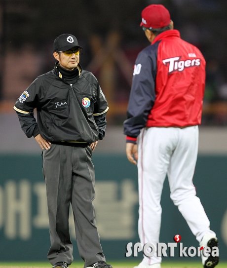 29일 오후 광주-기아챔피언스필드에서 열린 ‘2014프로야구’ KIA 타이거즈와 SK 와이번스의 경기에서 KIA 선동열 감독이 2회초 무사 1,3루 때 1루주자 조동화의 도루를 세이프 선언한 나광남 2루심에게 다가가 판정에 대해 어필을 하고 있다. 나광남 2루심은 3회초에 앞서 박근영 심판으로 교체됐다
