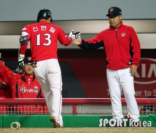 29일 오후 광주-기아챔피언스필드에서 열린 ‘2014프로야구’ KIA 타이거즈와 SK 와이번스의 경기에서7번 신현철이 3회초 1사 후 솔로홈런을 치고 홈인한 뒤 이만수 감독의 환영을 받고 있다.