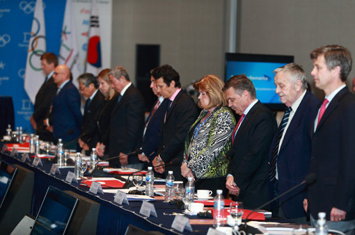 29일 강원도 평창 알펜시아리조트 컨벤션센터에서 개막한 국제올림픽위원회(IOC) 제3차 조정위원회에 앞서 참석자들이 세월호 참사의 희생자들을 추도하는 묵념을 하고 있다. 사진제공|평창동계올림픽조직위원회