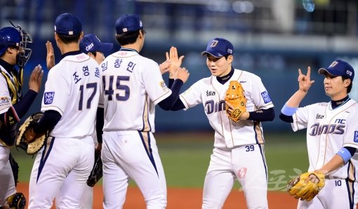 1일 창원 마산야구장에서 열린 ‘2014 한국야쿠르트 세븐 프로야구’ NC 다이노스와 LG 트윈스의 경기에서 NC가 박민우의 맹활약에 힘입어 LG에 10-5로 승리했다. 경기에 승리한 NC 선수들이 그라운드에서 기쁨을 나누고 있다.