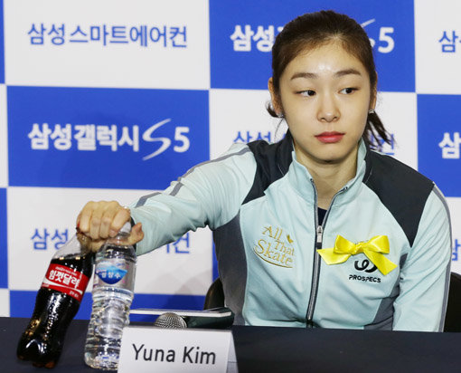 김연아가 2일 오후 서울 송파구 올림픽공원 체조경기장 내 특설 아이스링크장에서 열린 기자회견에서 물병을 치우고 있다.