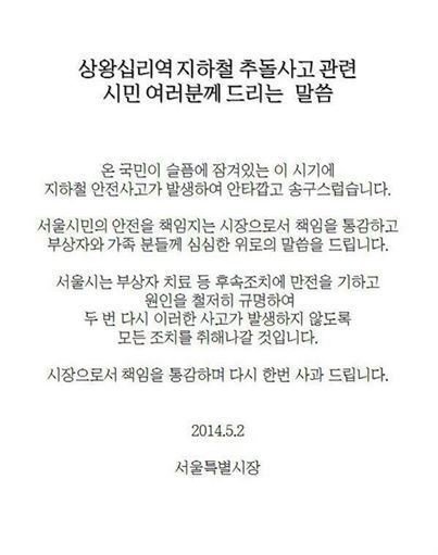 이어 "부상자에 대한 치료와 빠른 복구를 통한 지하철 정상화, 사고 원인규명을 통한 재발방지조치야 말로 위기에 영웅적 행동을 해주신 시민들에 대한 보답의 길이란 생각해 현장을 떠나지 못하고 상황실을 지켰습니다. 다시한번 시민의 안전을 책임지는 시장으로 책임을 다하지 못한 점 사과드립니다. 서울이 안전해야 시민이 안심한다는 생각으로 더 노력하겠습니다"고 덧붙이며 사과했다.