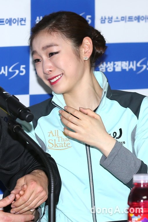 ‘피겨여왕’ 김연아가 6일 오후 서울 송파구 올림픽공원 체조경기장에서 열린 ‘삼성갤럭시★스마트에어컨 올댓스케이트 2014’ 아이스쇼를 마치고 기자회견 중 눈물을 흘리고 있다