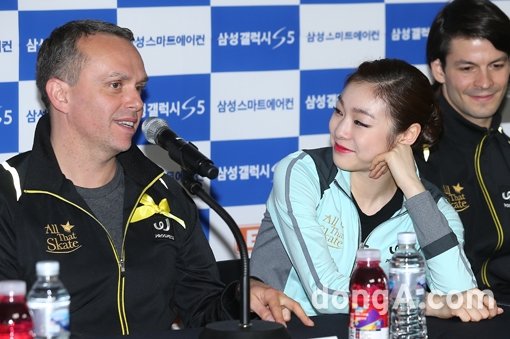 ‘피겨여왕’ 김연아와 데이비드 윌슨 코치가 6일 오후 서울 송파구 올림픽공원 체조경기장에서 열린 ‘삼성갤럭시★스마트에어컨 올댓스케이트 2014’ 아이스쇼를 마친 후 기자회견서 취재진의 질문에 답하고 있다.