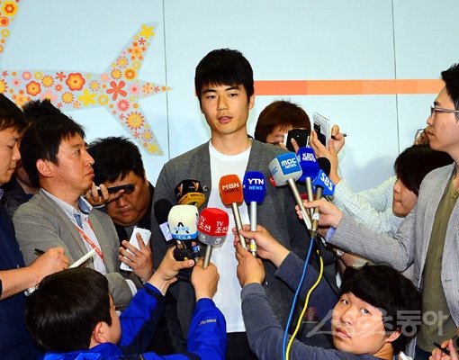 오른 무릎 슬개건염(인대 염증)으로 조기 귀국한 기성용(선덜랜드·가운데)이 6일 인천국제공항에서 국내 언론을 상대로 기자회견을 하고 있다. 대표팀 주치의 송준섭 박사는 “팀 훈련 참여를 늦출 만큼 심각하지 않다”고 설명했다. 인천국제공항|박화용 기자 inphoto@donga.com 트위터@seven7sola