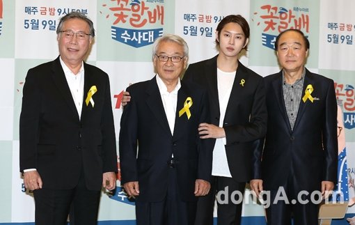 배우 변희봉(왼쪽부터), 이순재, 김희철, 장광이 7일 오전 서울 중구 프레스센터에서 열린 케이블채널 tvN ‘꽃할배 수사대’ 제작발표회에서 포토타임을 하고 있다.