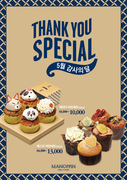 MPK그룹이 운영하는 커피&머핀 전문점 마노핀이 5월 가정의 달을 맞아 신제품 머핀과 함께 한정판 세트 2종을 출시했다. 귀여운 4가지 동물로 이루어진 ‘캐릭터 머핀세트’와 고급스러운 외관의 6개 머핀이 담긴 ‘베스트 머핀세트’ 2종이다.