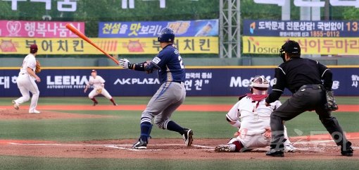 7일 서울 목동야구장에서 열린 2014 한국야쿠르트 세븐 프로야구 넥센히어로즈 대 NC다이노스 경기 1회초 무사 만루 NC 이호준이 1타점 적시타를 치고 있다.