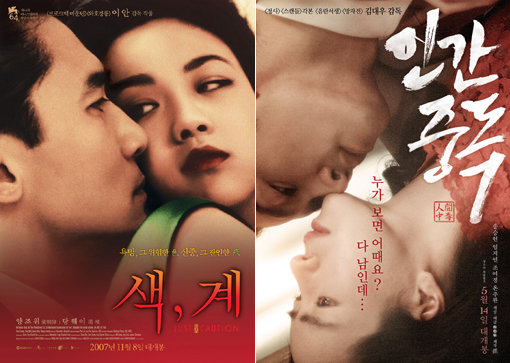 ‘색,계’ 포스터(왼쪽)-‘인간중독’ 포스터