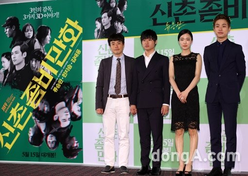 감독 류승완, 배우 이다윗, 손수현, 박정민(왼쪽부터)이 9일 오후 서울 왕십리 CGV에서 열린 3D영화 ‘신촌좀비만화’ 언론배급시사회에 참석해 포토타임을 하고 있다.