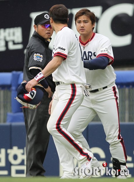 홍성흔, 흥분한 오재원 말리며 ‘진정해’