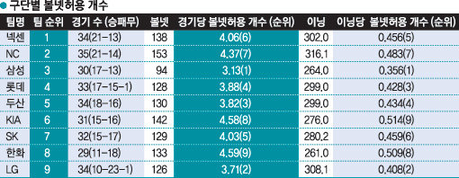 이닝당 0.36개 9개 구단 중 0.3개대 유일