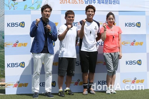 신승준 아나운서(왼쪽부터)와 가수 이정, 2AM 창민, 신수지 전 리듬체조 선수가 15일 오후 경기도 남양주시 남양주체육문화센터 어린이 축구장에서 열린 KBSN ‘날아라 슛돌이 시즌6’ 현장공개 및 기자간담회에서 포토타임을 하고 있다.