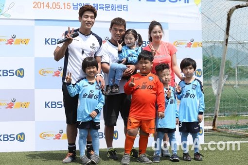 가수 창민, 이정, 신수지 전 리듬체조 선수와 슛돌이 멤버 김우진, 이효린, 양서현, 이하랑, 김해일이 15일 오후 경기도 남양주시 남양주체육문화센터 어린이 축구장에서 열린 KBSN ‘날아라 슛돌이 시즌6’ 현장공개 및 기자간담회에서 포토타임을 하고 있다.