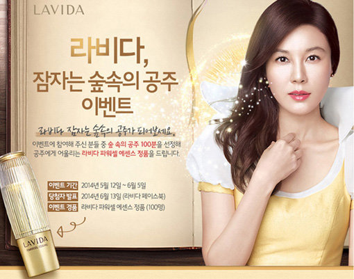 코리아나화장품이 대표 브랜드 라비다의 론칭 2주년을 기념하여 ‘잠자는 숲 속의 공주’ 페이스북 이벤트를 실시한다. 이벤트 참여는 6월 5일까지 라비다 공식 페이스북(facebook.com/thelavida)과 친구를 맺은 후 라비다 숲 속의 공주에 어울리는 페이스북 내 본인 사진을 선택하고, 이야기에 등장하는 마녀, 요정, 난쟁이 역할에 어울리는 페이스북 친구들을 초대하면 완료된다.