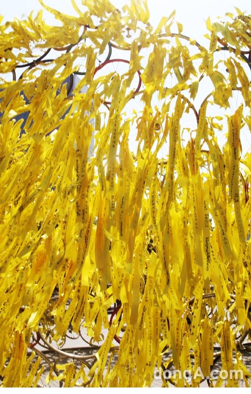 세월호 침몰 참사 한달째인 15일 오후 서울 종로구 청계광장에서 세월호 참사 희생자를 추모하는 노란 리본이 바람에 날리고 있다.