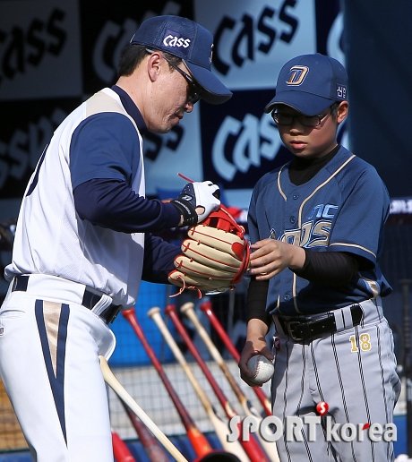 15일 오후 창원 마산야구장에서 ‘2014 한국 야쿠르트 세븐 프로야구’ NC 다이노스와 KIA 타이거즈의 경기가 열리기 전 NC 이동욱 코치가 볼보이에게 글러브 제대로 끼는 법을 알려주고 있다.