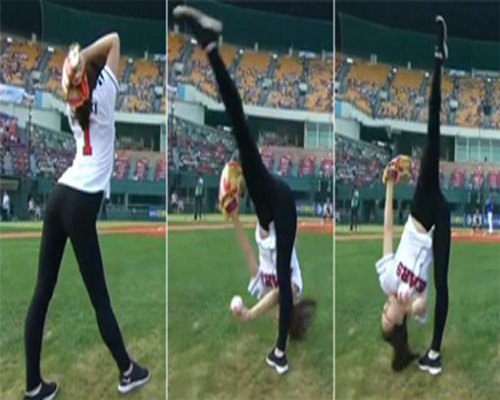 전 체조선수 신수지가 '날아라 슛돌이' 매니저로 활동 중인 가운데 그의 과거 시구 영상이 화제다.