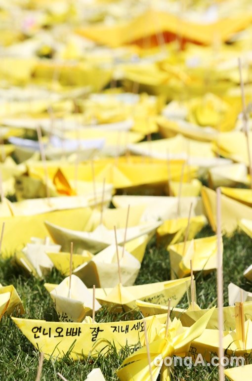 세월호 침몰 참사 한달째인 15일 오후 서울 중구 서울광장에서 한 시민이 세월호 참사 희생자를 추모하는 노란 종이배들이 놓여 있다.