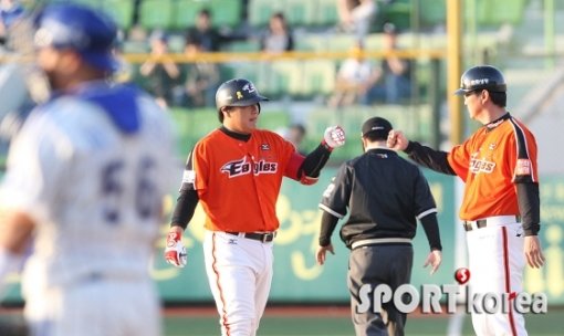 15일 오후 대구 시민야구장에서 열린 ‘2014 한국 야쿠르트 세븐 프로야구’ 삼성 라이온즈와 한화 이글스의 경기 1회초 1사 1,3루에서 한화 김태균이 1타점 적시타를 친 후 강석천 1루코치의 환영을 받고 있다.