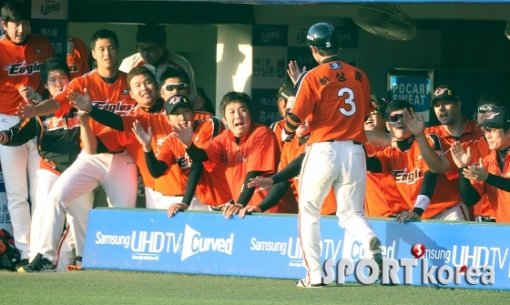 15일 오후 대구 시민야구장에서 열린 ‘2014 한국 야쿠르트 세븐 프로야구’ 삼성 라이온즈와 한화 이글스의 경기 1회초 1사 1,3루에서 한화 김태균의 1타점 적시타로 홈을 밟은 3루주자 한상훈이 덕아웃 동료선수들의 환영을 받고 있다.