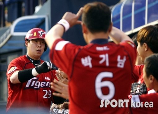 15일 오후 창원 마산야구장에서 열린 ‘2014 한국 야쿠르트 세븐 프로야구’ NC 다이노스와 KIA 타이거즈의 경기 4회초 무사 상황에서 KIA 필이 NC 이민호를 상대로 필에 이은 백투백 홈런을 터뜨린 후 더그아웃 동료들의 환영을 받고 있다.