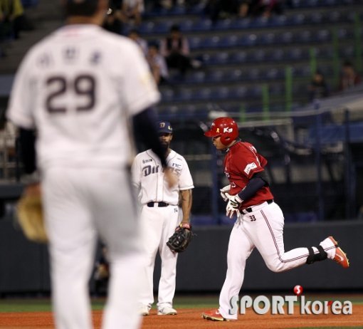 15일 오후 창원 마산야구장에서 열린 ‘2014 한국 야쿠르트 세븐 프로야구’ NC 다이노스와 KIA 타이거즈의 경기 6회초 2사 2루 상황에서 KIA 김주형이 투런포를 쏘아올린 후 그라운드를 돌고 있다.