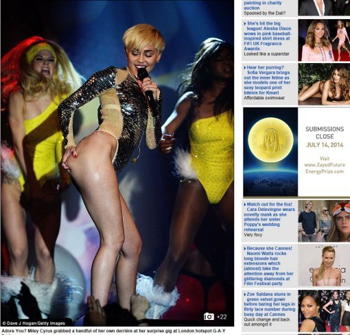 이날도 역시 마일리 사이러스의 무대는 파격적이었다. 남성의 중요 신체 부위를 본뜬 소품을 무대 위에 준비해 성행위를 연상케 하는 몸짓으로 관객들을 사로잡았다.