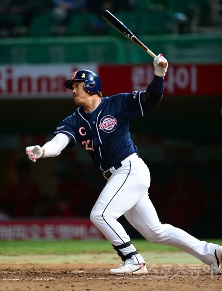 16일 잠실 NC전에서도 김현수가 2안타(1홈런) 4타점으로 팀을 승리로 이끌었다. 리그 최고의 사이드암투수 NC 이재학을 상대로 1회부터 타점을 올리며 경기의 흐름을 끌고 가더니, 4-2로 앞선 2회 1사 2루서도 1타점짜리 우전 적시타를 때려냈다. 5-3으로 추격당한 7회 무사 1루서 손정욱을 상대로 승부에 쐐기를 박는 2점 홈런을 쏘아 올렸다. 시즌 7호. 칸투도 바뀐 투수 임창민을 공략해 백투백홈런(시즌 11호)을 쳐냈고, 홍성흔은 멀티히트로 찬스를 계속 만들어갔다.