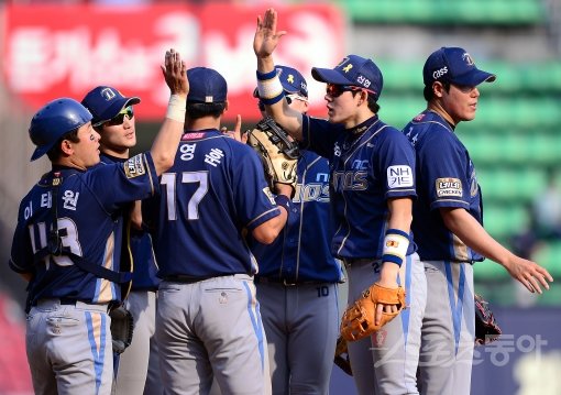 18일 서울 잠실야구장에서 열린 2014 한국야쿠르트 세븐 프로야구 두산베어스 대 NC다이노스 경기에서 9-4 승리를 거둔 NC 선수들이 경기 종료 후 하이파이브 하고 있다.