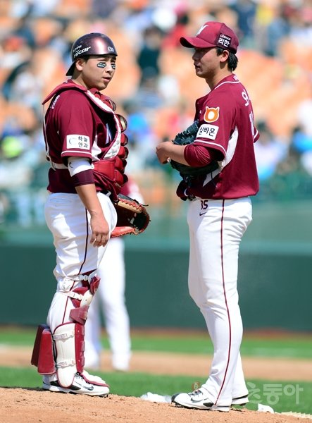 야구는 투수의 경기일까 아니면 포수의 경기일까. 18.44m 거리에서 사인으로 말을 주고받는 배터리를 부부라고 부른다. 오래 산 부부는 말이 없어도 서로를 이해하지만 배터리는 사인의 내용과 타이밍이 중요하다. 18일 사직구장에서 넥센의 포수 허도환(왼쪽)과 투수 오재영이 마운드에서 얘기를 나누고 있다. 사직|김민성 기자 marineboy@donga.com 트위터@bluemarine007