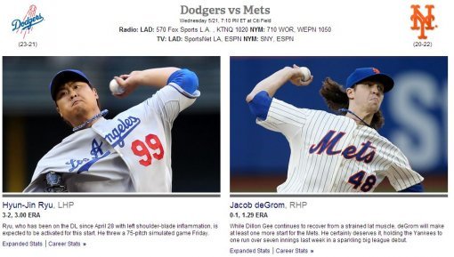 LA 다저스 류현진-뉴욕 메츠 제이콥 디그롬. 사진=메이저리그 공식 홈페이지