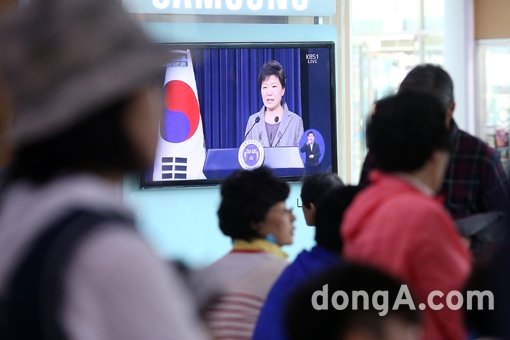 박근혜 대통령이 세월호 참사 관련 대국민담화문을 발표한 19일 오전 서울역 대합실에서 시민들이 TV를 통해 발표를 지켜보고 있다.