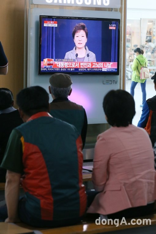 박근혜 대통령이 세월호 참사 관련 대국민담화문을 발표한 19일 오전 서울역 대합실에서 시민들이 TV를 통해 발표를 지켜보고 있다.